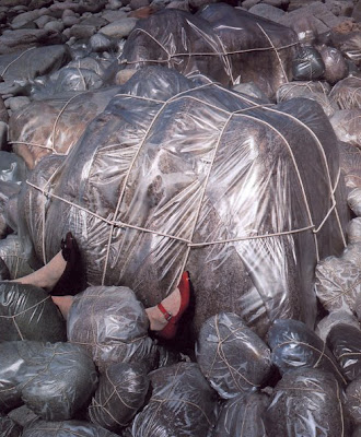 Guy Bourdin, fotógrafo y pintor francés, (París, 2 de Diciembre de 1928-29 de Marzo de 1991). Pasó una infancia difícil, debido en esencia y ajustándose a la realidad (alejado de los diversos rumores acerca de su vida personal y familiar) a la siguiente situación: su madre, una mujer casada, mantuvo una relación extramatrimonial de la cual nació Bourdin. Tras el parto, cuando su marido descubrió que el hijo no era suyo, se opuso a cualquier tipo de reconocimiento. Desde entonces, su padre biológico: Maurice Bourdin y la madre de éste, se hicieron responsables de su cuidado y educación. En el resto de su vida nunca volvió a ver a su madre. Posteriormente y dejada atrás su etapa infantil, tras entrar en contacto con el marchante de arte: Lucien Henry, a mediados de los cuarenta y con tan sólo 18 años, desarrolla por primera vez su faceta como pintor durante los seis meses que permanece junto a Lucien en su casa de la Provenza. A partir de 1948, se enrola en el ejército del aire donde disfruta de su primera cámara y ejerce como fotógrafo durante su destino en Dakar (Senegal). Regresa a la capital francesa en 1950, para exponer sus trabajos pictóricos en la Rue de la Bourgogne Galerie de París y dos años después sus fotografías en la Galería 29 de la misma ciudad. Una exposición que cuenta con la introducción del fotógrafo e íntimo amigo Man Ray. Tras exhibir su obra en diversos eventos, dirige su carrera artística hacia el ámbito que mayor éxito le reporto: El mundo de la moda. De hecho aunque continuó explotando su faceta como dibujante hasta prácticamente el último de sus días (Fue el mayor de sus deseos, triunfar en la gran arte plástica de la pintura ya que consideraba la fotografía un arte y disciplina menor. Sin embargo, muestras en París o Nueva York de sus lienzos avalaban su potencial), centró su interés en captar la realidad a través de su objetivo. No en vano, para la década de los cincuenta, son ya famosas sus obras orientadas a publicitar calzados de las casas Perugia o Valentino, pero es en los sesenta, cuando en sintonía con un prestigio profesional en alza recibe los primeros encargos de Harper´s Bazar o Photo que añadidos a su contrato con la publicación Vogue, lo encumbran a una selecta posición. Un status que en lo que respecta a su relación con Vogue, le permitió trabajar de manera incesante a lo largo de treinta años para su edición francesa y ser responsable de una veintena de campañas publicitarias para la reconocida firma de zapatos: Charles Jourdain.